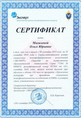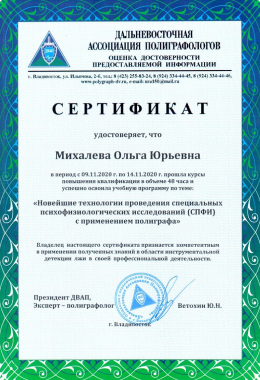 Курсы повышения квалификации «Новейшие технологии проведения СПФИ с применением полиграфа», 2020 год.